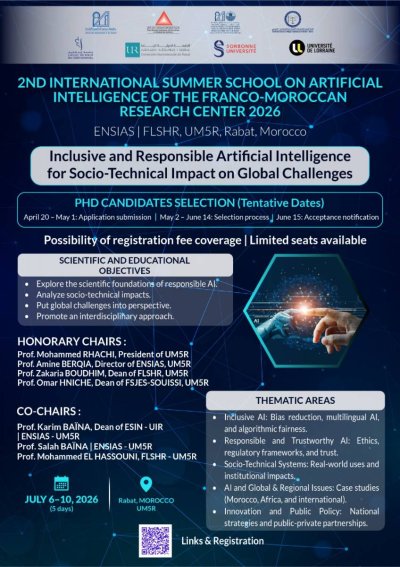 The second International Summer School on Artificial Intelligence of the Franco-Moroccan Research Center 2026, aims to train a new generation of researchers, engineers, policymakers, and entrepreneurs capable of designing, deploying, and governing AI systems with high societal impact, while explicitly accounting for the complex interactions between technologies, institutions, cultures, and real-world practices.