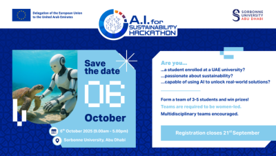 The AI for Sustainability Hackathon brings together young bright minds from across the country for a thrilling one-day challenge. You’ll team up, create AI-powered solutions to tackle urgent environmental issues, and pitch your ideas to top industry experts from the EU and the UAE.