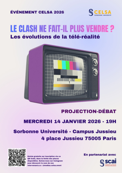 Each year, the Master 2 in Media and Digital Management organizes the CELSA event, designed to showcase the Master’s program and the school. For the 2026 edition, we have chosen to examine reality television and its transformations through a screening and discussion entitled Does Conflict No Longer Sell? The Evolution of Reality TV, which will take place on Wednesday, January 14, 2026, starting at 7:00 p.m., at the Jussieu campus of Sorbonne University (4 Place Jussieu, 75005 Paris).