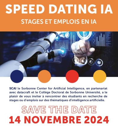 SCAI, le Sorbonne Center for Artificial Intelligence, en partenariat avec datacraft et le Collège Doctoral de Sorbonne Université, a le plaisir d'inviter les étudiants et les entreprises à un événement de networking axé sur les opportunités de stages et d'emplois dans le domaine de l'intelligence artificielle.