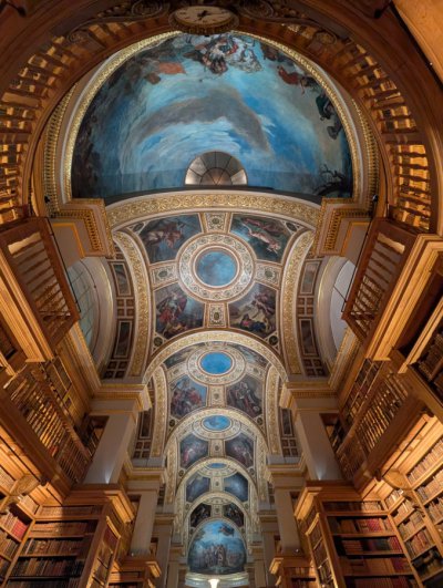 The French National Assembly is home to two decorative ensembles painted by Eugène Delacroix and his assistants. The first, restored thirty years ago, is located in the Salon Delacroix, adjacent to the chamber. But it is the ceiling of the library that presents the greatest artistic and technical complexity. Spanning approximately fifty meters in length and twenty meters in width, the décor features five domes, each divided into four sections and adorned with architectural and sculptural elements, all framed by two hemicycles. The entire ensemble rises to a height of about twenty meters.
