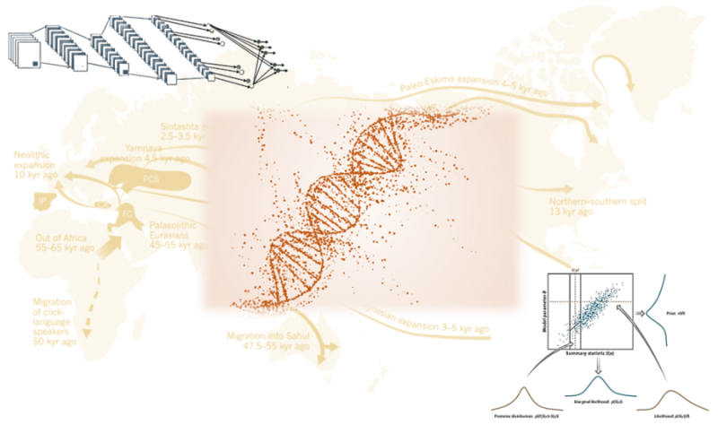 Develop approximate Bayesian computation (ABC) and deep learning methods to infer the demographic history of populations, from current and ancient DNA sequences.