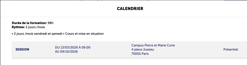 CPF: Eligible (The CPF, or Compte personnel de formation, is a French government program that allows individuals to finance professional training. Stating it is "Eligible" means participants can use their CPF funds to pay for the course.)